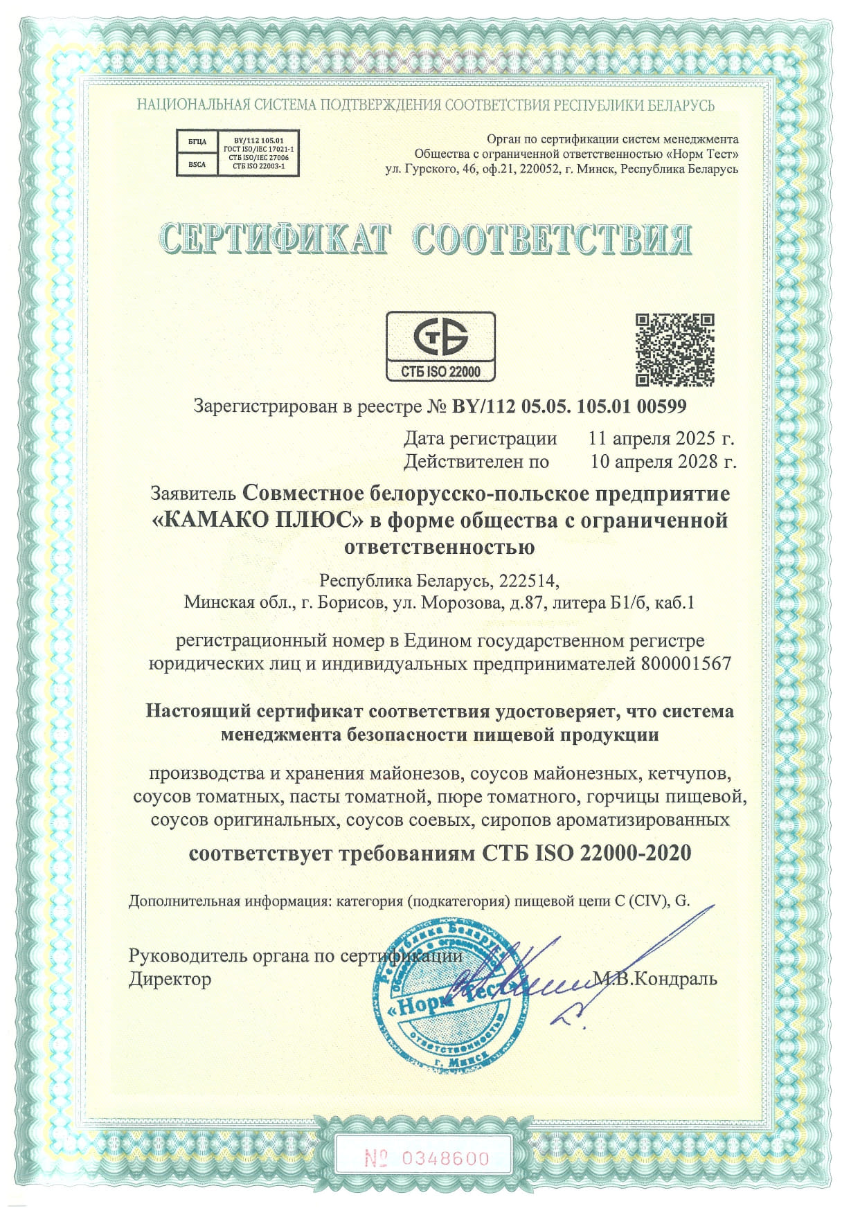 В условиях роста требований к безопасности продуктов питания компания «КАМАКО» стремится опережать ожидания потребителей и партнёров. Именно поэтому мы внедрили систему управления безопасностью пищевой продукции, соответствующую требованиям СТБ ISO 22000-2020 — одного из наиболее авторитетных международных стандартов в этой сфере.
